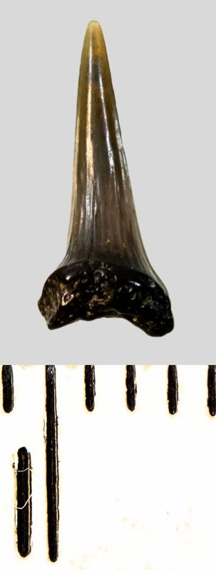 Зуб (фрагмент). Акула. Eostriatolamia subulata (Agassiz, 1843). Классификация: Хордовые Chordata, Позвоночные Vertebrata, Хрящевые рыбы Chondrichthyes, Пластиножаберные Elasmobranchii, Акулы Selachii, Ламнообразные Lamniformes, Песчаные акулы Odontaspididae