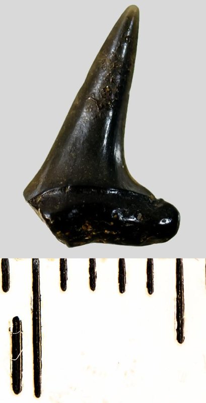Зуб (фрагмент). Акула. Eostriatolamia subulata (Agassiz, 1843). Классификация: Хордовые Chordata, Позвоночные Vertebrata, Хрящевые рыбы Chondrichthyes, Пластиножаберные Elasmobranchii, Акулы Selachii, Ламнообразные Lamniformes, Песчаные акулы Odontaspididae