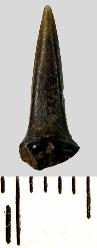 Зуб (фрагмент). Акула. Eostriatolamia subulata (Agassiz, 1843). Классификация: Хордовые Chordata, Позвоночные Vertebrata, Хрящевые рыбы Chondrichthyes, Пластиножаберные Elasmobranchii, Акулы Selachii, Ламнообразные Lamniformes, Песчаные акулы Odontaspididae