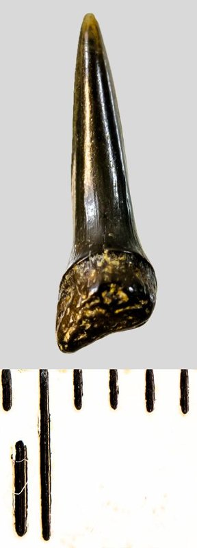 Зуб (фрагмент). Акула. Eostriatolamia subulata (Agassiz, 1843). Классификация: Хордовые Chordata, Позвоночные Vertebrata, Хрящевые рыбы Chondrichthyes, Пластиножаберные Elasmobranchii, Акулы Selachii, Ламнообразные Lamniformes, Песчаные акулы Odontaspididae