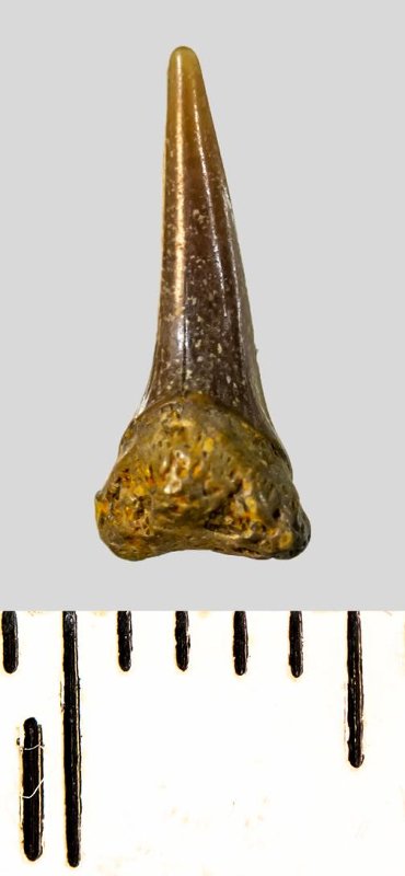 Зуб (фрагмент). Акула. Eostriatolamia subulata (Agassiz, 1843). Классификация: Хордовые Chordata, Позвоночные Vertebrata, Хрящевые рыбы Chondrichthyes, Пластиножаберные Elasmobranchii, Акулы Selachii, Ламнообразные Lamniformes, Песчаные акулы Odontaspididae