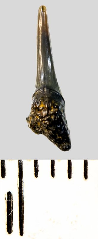 Коронка мелкого бокового зуба темно-серого цвета, колюще-режущего типа, S-образно изогнутая, с гладким режущим краем. С лингвальной стороны у основания коронки на эмали имеется скульптура в виде слабой продольной струйчатости. Корень охристый, сильно окатанный, сохранился фрагментарно