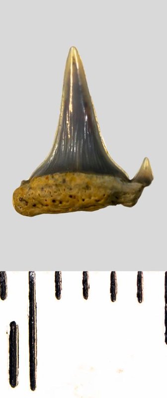 Зуб (фрагмент). Акула. Eostriatolamia subulata (Agassiz, 1843). Классификация: Хордовые Chordata, Позвоночные Vertebrata, Хрящевые рыбы Chondrichthyes, Пластиножаберные Elasmobranchii, Акулы Selachii, Ламнообразные Lamniformes, Песчаные акулы Odontaspididae