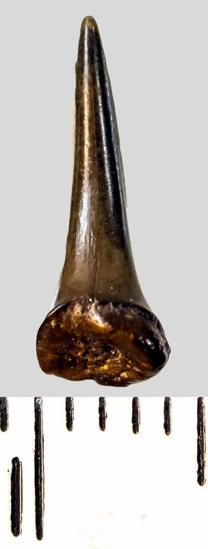 Коронка мелкого бокового зуба темно-серого цвета, колюще-режущего типа, S-образно изогнутая, с гладким режущим краем. С лингвальной стороны у основания коронки на эмали имеется скульптура в виде слабой продольной струйчатости. Корень охристый, сильно окатанный, сохранился фрагментарно