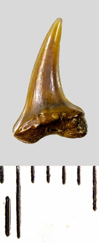 Зуб (фрагмент). Акула. Eostriatolamia subulata (Agassiz, 1843). Классификация: Хордовые Chordata, Позвоночные Vertebrata, Хрящевые рыбы Chondrichthyes, Пластиножаберные Elasmobranchii, Акулы Selachii, Ламнообразные Lamniformes, Песчаные акулы Odontaspididae