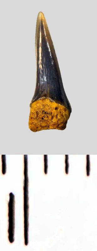 Зуб (фрагмент). Акула. Eostriatolamia subulata (Agassiz, 1843). Классификация: Хордовые Chordata, Позвоночные Vertebrata, Хрящевые рыбы Chondrichthyes, Пластиножаберные Elasmobranchii, Акулы Selachii, Ламнообразные Lamniformes, Песчаные акулы Odontaspididae