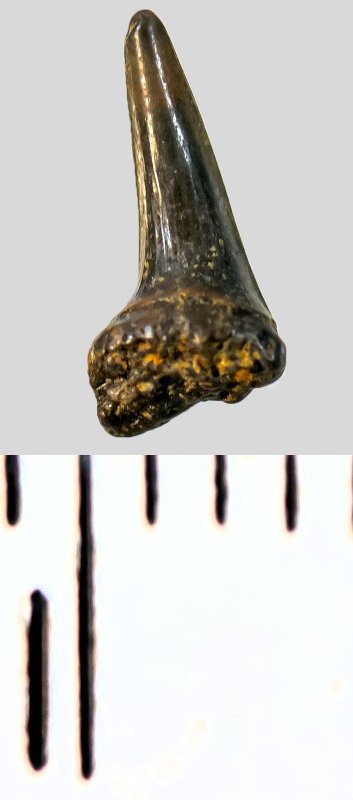 Зуб (фрагмент). Акула. Eostriatolamia subulata (Agassiz, 1843). Классификация: Хордовые Chordata, Позвоночные Vertebrata, Хрящевые рыбы Chondrichthyes, Пластиножаберные Elasmobranchii, Акулы Selachii, Ламнообразные Lamniformes, Песчаные акулы Odontaspididae