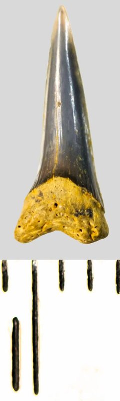 Зуб (фрагмент). Акула. Eostriatolamia subulata (Agassiz, 1843). Классификация: Хордовые Chordata, Позвоночные Vertebrata, Хрящевые рыбы Chondrichthyes, Пластиножаберные Elasmobranchii, Акулы Selachii, Ламнообразные Lamniformes, Песчаные акулы Odontaspididae