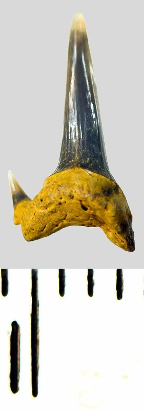 Зуб. Акула. Eostriatolamia subulata (Agassiz, 1843). Классификация: Хордовые Chordata, Позвоночные Vertebrata, Хрящевые рыбы Chondrichthyes, Пластиножаберные Elasmobranchii, Акулы Selachii, Ламнообразные Lamniformes, Песчаные акулы Odontaspididae