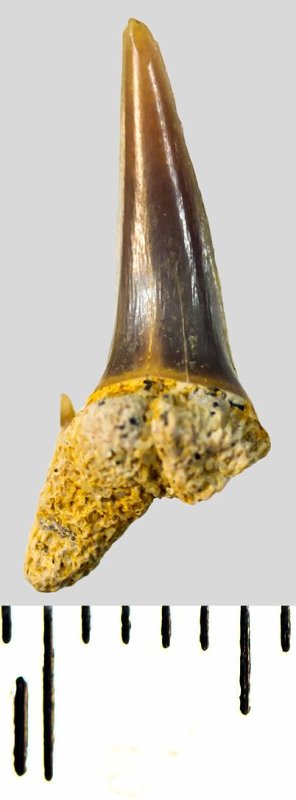 Мелкий боковой зуб с коронкой серого цвета, колюще-режущего типа, S-образно изогнутой, с гладким режущим краем. С лингвальной стороны у основания коронки на эмали имеется скульптура в виде слабой продольной струйчатости. Корень охристый, арочный, умеренно массивный, со следами окатанности; правая ветвь утрачена. Имеется одна питательная борозда с лингвальной стороны корня. Имелась одна пара добавочных зубцов коронки, сохранился только левый.