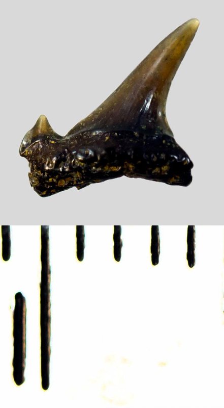 Мелкий боковой зуб с коронкой серого цвета, колюще-режущего типа, S-образно изогнутой, с гладким режущим краем. С лингвальной стороны у основания коронки на эмали имеется скульптура в виде слабой продольной струйчатости. Корень охристый, арочный, умеренно массивный, со следами окатанности; правая ветвь утрачена. Имеется одна питательная борозда с лингвальной стороны корня. Имелась одна пара добавочных зубцов коронки, сохранился только левый.