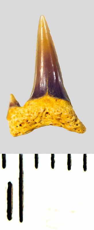 Мелкий боковой зуб с коронкой серого цвета, колюще-режущего типа, S-образно изогнутой, с гладким режущим краем. С лингвальной стороны у основания коронки на эмали имеется скульптура в виде слабой продольной струйчатости. Корень охристый, арочный, умеренно массивный, со следами окатанности; правая ветвь утрачена. Имеется одна питательная борозда с лингвальной стороны корня. Имелась одна пара добавочных зубцов коронки, сохранился только левый.