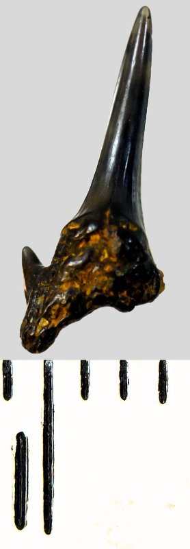 Мелкий боковой зуб с коронкой серого цвета, колюще-режущего типа, S-образно изогнутой, с гладким режущим краем. С лингвальной стороны у основания коронки на эмали имеется скульптура в виде слабой продольной струйчатости. Корень охристый, арочный, умеренно массивный, со следами окатанности; правая ветвь утрачена. Имеется одна питательная борозда с лингвальной стороны корня. Имелась одна пара добавочных зубцов коронки, сохранился только левый.
