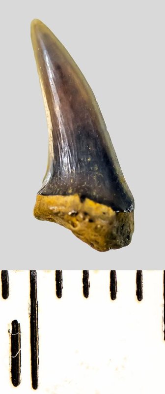 Зуб (фрагмент). Акула. Eostriatolamia subulata (Agassiz, 1843). Классификация: Хордовые Chordata, Позвоночные Vertebrata, Хрящевые рыбы Chondrichthyes, Пластиножаберные Elasmobranchii, Акулы Selachii, Ламнообразные Lamniformes, Песчаные акулы Odontaspididae