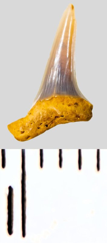 Зуб (фрагмент). Акула. Eostriatolamia subulata (Agassiz, 1843). Классификация: Хордовые Chordata, Позвоночные Vertebrata, Хрящевые рыбы Chondrichthyes, Пластиножаберные Elasmobranchii, Акулы Selachii, Ламнообразные Lamniformes, Песчаные акулы Odontaspididae