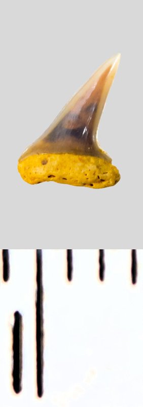 Зуб (фрагмент). Акула. Eostriatolamia subulata (Agassiz, 1843). Классификация: Хордовые Chordata, Позвоночные Vertebrata, Хрящевые рыбы Chondrichthyes, Пластиножаберные Elasmobranchii, Акулы Selachii, Ламнообразные Lamniformes, Песчаные акулы Odontaspididae