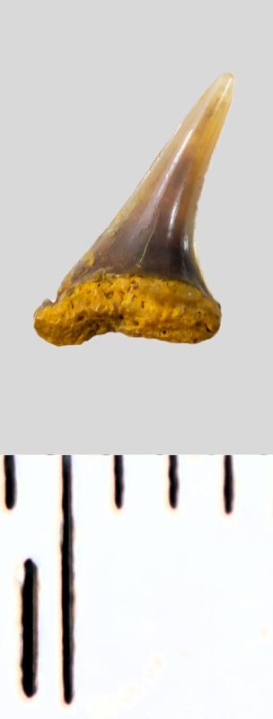 Зуб (фрагмент). Акула. Eostriatolamia subulata (Agassiz, 1843). Классификация: Хордовые Chordata, Позвоночные Vertebrata, Хрящевые рыбы Chondrichthyes, Пластиножаберные Elasmobranchii, Акулы Selachii, Ламнообразные Lamniformes, Песчаные акулы Odontaspididae