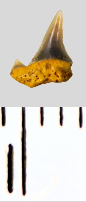 Зуб (фрагмент). Акула. Eostriatolamia subulata (Agassiz, 1843). Классификация: Хордовые Chordata, Позвоночные Vertebrata, Хрящевые рыбы Chondrichthyes, Пластиножаберные Elasmobranchii, Акулы Selachii, Ламнообразные Lamniformes, Песчаные акулы Odontaspididae