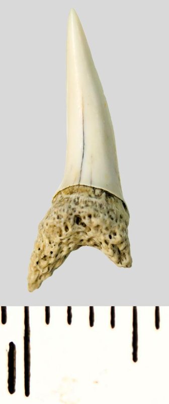 Зуб. Акула. Odontaspis striatula Dalinkevicius, 1935. Классификация: Хордовые Chordata, Позвоночные Vertebrata, Хрящевые рыбы Chondrichthyes, Пластиножаберные Elasmobranchii, Акулы Selachii, Ламнообразные Lamniformes, Песчаные акулы Odontaspididae