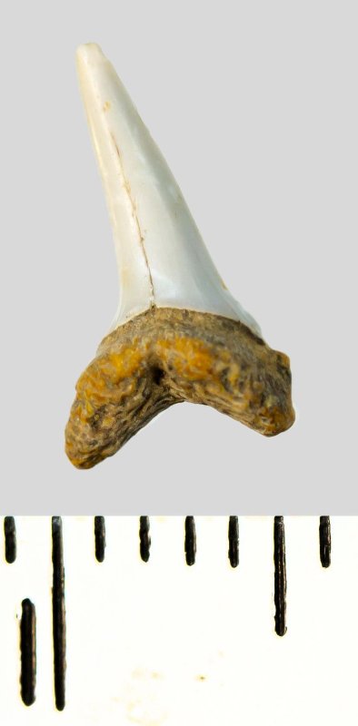 Зуб. Акула. Odontaspis striatula Dalinkevicius, 1935. Классификация: Хордовые Chordata, Позвоночные Vertebrata, Хрящевые рыбы Chondrichthyes, Пластиножаберные Elasmobranchii, Акулы Selachii, Ламнообразные Lamniformes, Песчаные акулы Odontaspididae
