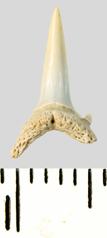 Зуб. Акула. Odontaspis striatula Dalinkevicius, 1935. Классификация: Хордовые Chordata, Позвоночные Vertebrata, Хрящевые рыбы Chondrichthyes, Пластиножаберные Elasmobranchii, Акулы Selachii, Ламнообразные Lamniformes, Песчаные акулы Odontaspididae