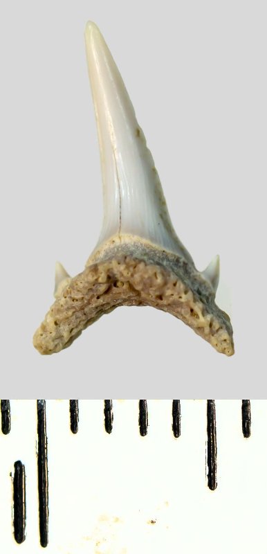 Зуб. Акула. Odontaspis striatula Dalinkevicius, 1935. Классификация: Хордовые Chordata, Позвоночные Vertebrata, Хрящевые рыбы Chondrichthyes, Пластиножаберные Elasmobranchii, Акулы Selachii, Ламнообразные Lamniformes, Песчаные акулы Odontaspididae