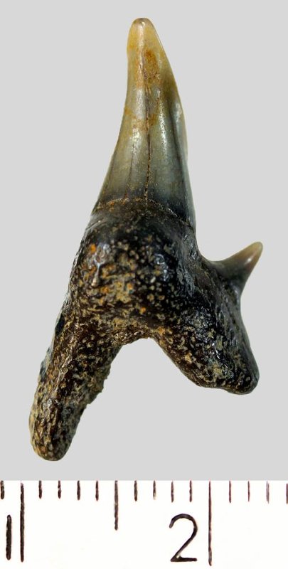 Зуб. Акула. Protolamna cf. sokolovi Cappetta, 1980. Классификация: Хордовые Chordata, Позвоночные Vertebrata, Хрящевые рыбы Chondrichthyes, Пластиножаберные Elasmobranchii, Акулы Selachii, Ламнообразные Lamniformes, Pseudoscapanorhynchidae