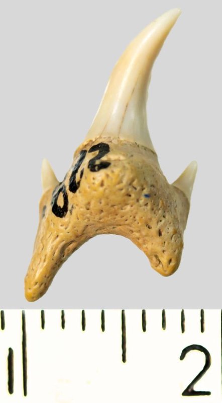 Зуб. Акула. Protolamna cf. sokolovi Cappetta, 1980. Классификация: Хордовые Chordata, Позвоночные Vertebrata, Хрящевые рыбы Chondrichthyes, Пластиножаберные Elasmobranchii, Акулы Selachii, Ламнообразные Lamniformes, Pseudoscapanorhynchidae