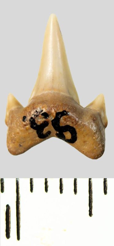 Зуб. Акула. Archaeolamna cf. kopingensis (Davis, 1890). Классификация: Хордовые Chordata, Позвоночные Vertebrata, Хрящевые рыбы Chondrichthyes, Пластиножаберные Elasmobranchii, Акулы Selachii, Ламнообразные Lamniformes, Cretoxyrhinidae