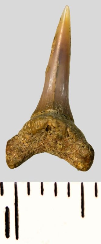 Зуб. Акула. Eostriatolamia subulata (Agassiz, 1843). Классификация: Хордовые Chordata, Позвоночные Vertebrata, Хрящевые рыбы Chondrichthyes, Пластиножаберные Elasmobranchii, Акулы Selachii, Ламнообразные Lamniformes, Песчаные акулы Odontaspididae