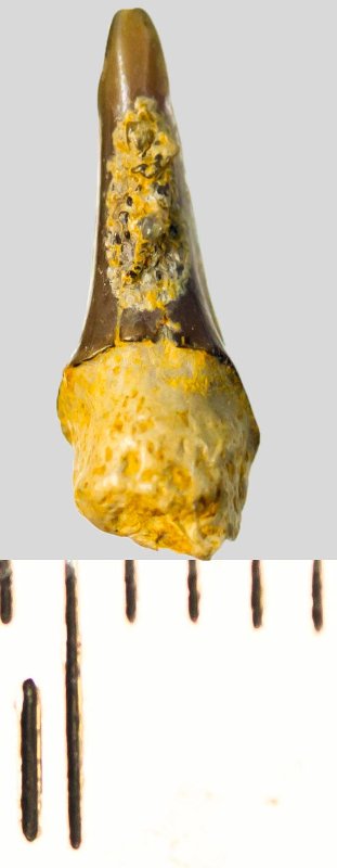 Зуб (фрагмент). Акула. Lamniformes gen. indet. Классификация: Хордовые Chordata, Позвоночные Vertebrata, Хрящевые рыбы Chondrichthyes, Пластиножаберные Elasmobranchii, Акулы Selachii, Ламнообразные Lamniformes