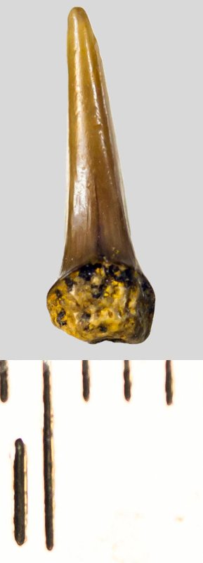 Зуб. Акула. Eostriatolamia subulata (Agassiz, 1843). Классификация: Хордовые Chordata, Позвоночные Vertebrata, Хрящевые рыбы Chondrichthyes, Пластиножаберные Elasmobranchii, Акулы Selachii, Ламнообразные Lamniformes, Песчаные акулы Odontaspididae