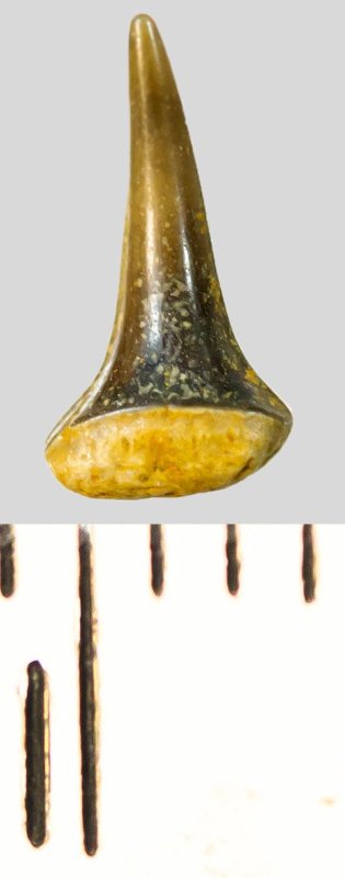 Зуб. Акула. Eostriatolamia subulata (Agassiz, 1843). Классификация: Хордовые Chordata, Позвоночные Vertebrata, Хрящевые рыбы Chondrichthyes, Пластиножаберные Elasmobranchii, Акулы Selachii, Ламнообразные Lamniformes, Песчаные акулы Odontaspididae