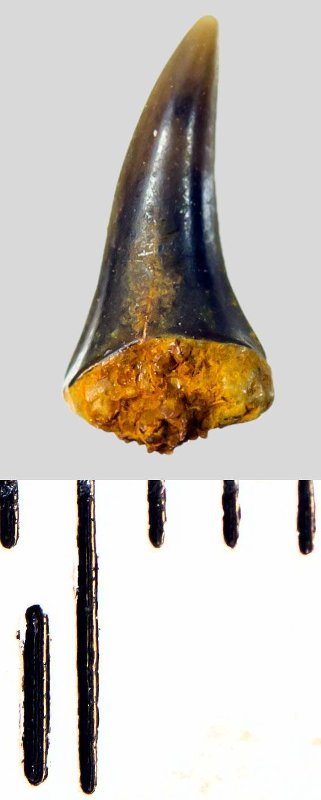 Зуб. Акула. Eostriatolamia subulata (Agassiz, 1843). Классификация: Хордовые Chordata, Позвоночные Vertebrata, Хрящевые рыбы Chondrichthyes, Пластиножаберные Elasmobranchii, Акулы Selachii, Ламнообразные Lamniformes, Песчаные акулы Odontaspididae