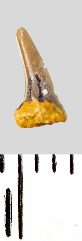 Зуб. Акула. Eostriatolamia subulata (Agassiz, 1843). Классификация: Хордовые Chordata, Позвоночные Vertebrata, Хрящевые рыбы Chondrichthyes, Пластиножаберные Elasmobranchii, Акулы Selachii, Ламнообразные Lamniformes, Песчаные акулы Odontaspididae