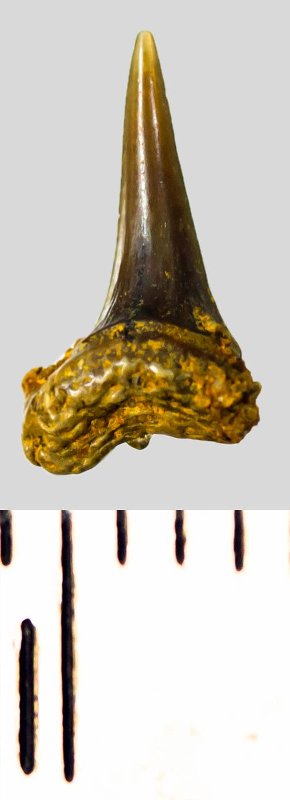 Зуб. Акула. Eostriatolamia subulata (Agassiz, 1843). Классификация: Хордовые Chordata, Позвоночные Vertebrata, Хрящевые рыбы Chondrichthyes, Пластиножаберные Elasmobranchii, Акулы Selachii, Ламнообразные Lamniformes, Песчаные акулы Odontaspididae