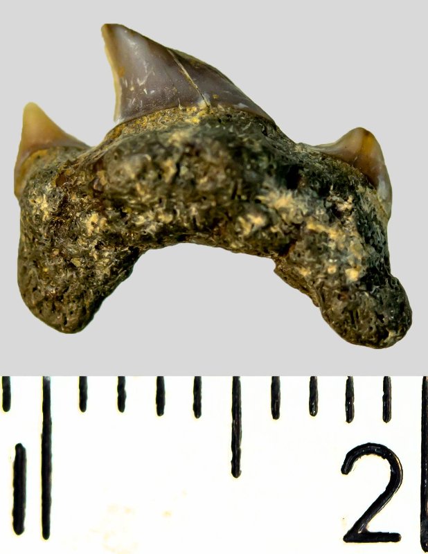 Зуб (фрагмент). Акула. Archaeolamna cf. kopingensis (Davis, 1890). Классификация: Хордовые Chordata, Позвоночные Vertebrata, Хрящевые рыбы Chondrichthyes, Пластиножаберные Elasmobranchii, Акулы Selachii, Ламнообразные Lamniformes, Cretoxyrhinidae