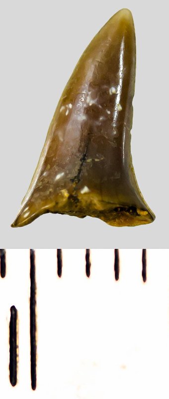 Зуб (фрагмент). Акула. Archaeolamna cf. kopingensis (Davis, 1890). Классификация: Хордовые Chordata, Позвоночные Vertebrata, Хрящевые рыбы Chondrichthyes, Пластиножаберные Elasmobranchii, Акулы Selachii, Ламнообразные Lamniformes, Cretoxyrhinidae