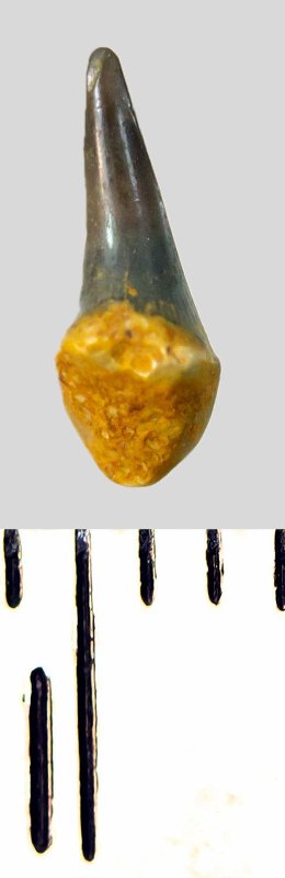 Зуб (фрагмент). Акула. Synechodus dubrisiensis (Mackie, 1863). Классификация: Хордовые Chordata, Позвоночные Vertebrata, Хрящевые рыбы Chondrichthyes, Пластиножаберные Elasmobranchii, Акулы Selachii, Синеходонтообразные Synechodontiformes, Palaeospinacidae