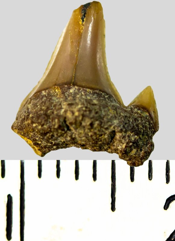 Зуб. Акула. Archaeolamna cf. kopingensis (Davis, 1890). Классификация: Хордовые Chordata, Позвоночные Vertebrata, Хрящевые рыбы Chondrichthyes, Пластиножаберные Elasmobranchii, Акулы Selachii, Ламнообразные Lamniformes, Cretoxyrhinidae