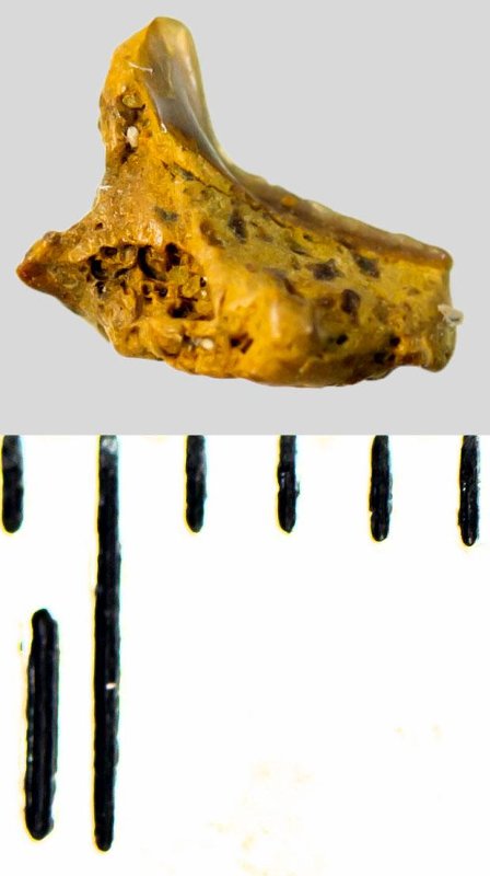 Зуб (фрагмент). Морские ангелы. Squatina cranei (Woodward, 1888). Классификация: Хордовые Chordata, Позвоночные Vertebrata, Хрящевые рыбы Chondrichthyes, Пластиножаберные Elasmobranchii, Акулы Selachii, Скватинообразные Squatiniformes, Морские ангелы Squatinidae