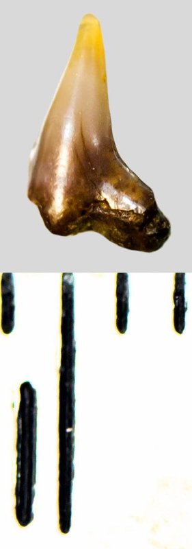 Зуб (фрагмент). Морские ангелы. Squatina cranei (Woodward, 1888). Классификация: Хордовые Chordata, Позвоночные Vertebrata, Хрящевые рыбы Chondrichthyes, Пластиножаберные Elasmobranchii, Акулы Selachii, Скватинообразные Squatiniformes, Морские ангелы Squatinidae