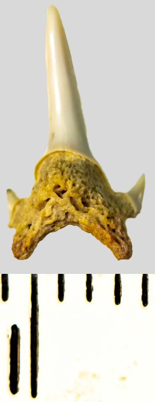 Зуб. Акула. Eostriatolamia subulata (Agassiz, 1843). Классификация: Хордовые Chordata, Позвоночные Vertebrata, Хрящевые рыбы Chondrichthyes, Пластиножаберные Elasmobranchii, Акулы Selachii, Ламнообразные Lamniformes, Песчаные акулы Odontaspididae