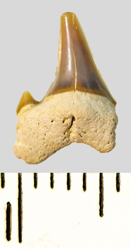 Зуб. Акула. Archaeolamna cf. kopingensis (Davis, 1890). Классификация: Хордовые Chordata, Позвоночные Vertebrata, Хрящевые рыбы Chondrichthyes, Пластиножаберные Elasmobranchii, Акулы Selachii, Ламнообразные Lamniformes, Cretoxyrhinidae