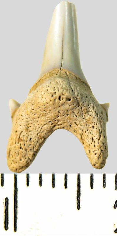 Зуб. Акула. Archaeolamna cf. kopingensis (Davis, 1890). Классификация: Хордовые Chordata, Позвоночные Vertebrata, Хрящевые рыбы Chondrichthyes, Пластиножаберные Elasmobranchii, Акулы Selachii, Ламнообразные Lamniformes, Cretoxyrhinidae