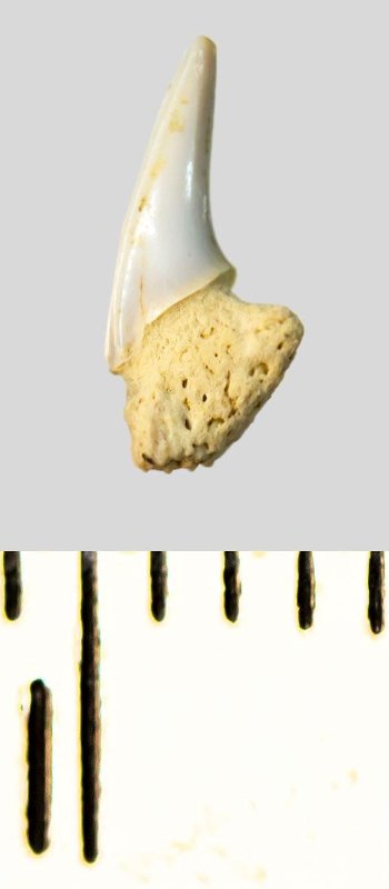 Зуб (фрагмент). Акула. Archaeolamna cf. kopingensis (Davis, 1890). Классификация: Хордовые Chordata, Позвоночные Vertebrata, Хрящевые рыбы Chondrichthyes, Пластиножаберные Elasmobranchii, Акулы Selachii, Ламнообразные Lamniformes, Cretoxyrhinidae