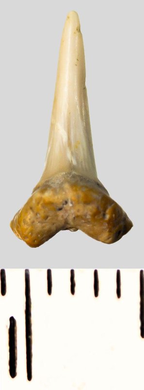 Зуб. Акула. Eostriatolamia subulata (Agassiz, 1843). Классификация: Хордовые Chordata, Позвоночные Vertebrata, Хрящевые рыбы Chondrichthyes, Пластиножаберные Elasmobranchii, Акулы Selachii, Ламнообразные Lamniformes, Песчаные акулы Odontaspididae