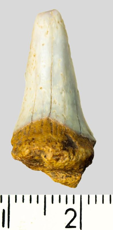 Зуб (фрагмент). Акула. Cretoxyrhina denticulata (Glueckman, 1957). Классификация: Хордовые Chordata, Позвоночные Vertebrata, Хрящевые рыбы Chondrichthyes, Пластиножаберные Elasmobranchii, Акулы Selachii, Ламнообразные Lamniformes, Cretoxyrhinidae