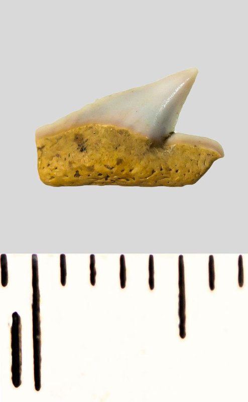 Зуб. Акула. Palaeoanacorax volgensis Glickman, 1971. Классификация: Хордовые Chordata, Позвоночные Vertebrata, Хрящевые рыбы Chondrichthyes, Пластиножаберные Elasmobranchii, Акулы Selachii, Ламнообразные Lamniformes, Anacoracidae