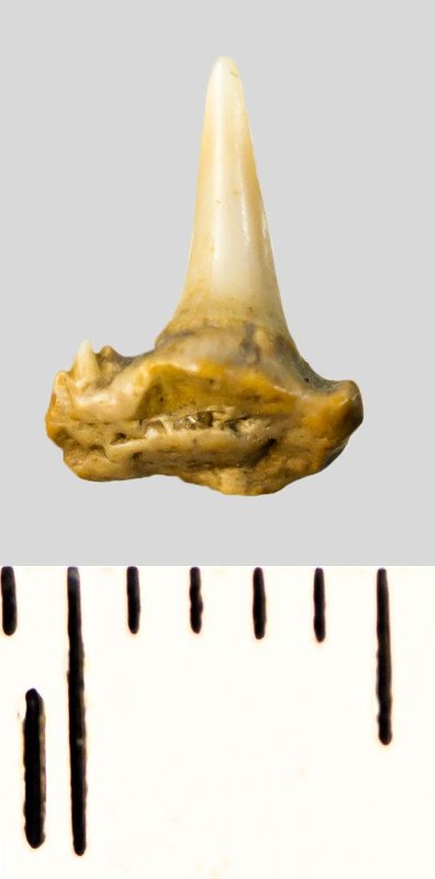 Зуб (фрагмент). Акула. Synechodus dubrisiensis (Mackie, 1863). Классификация: Хордовые Chordata, Позвоночные Vertebrata, Хрящевые рыбы Chondrichthyes, Пластиножаберные Elasmobranchii, Акулы Selachii, Синеходонтообразные Synechodontiformes, Palaeospinacidae